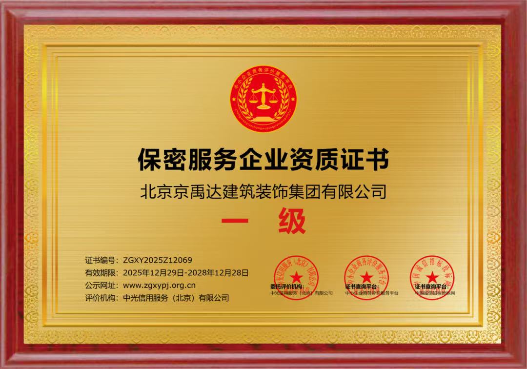 近日,北京京禹达建筑装饰集团凭借完善的保密管理体系、专业的技术服务能力及合规运营标准,顺利通过国家相关部门严苛审核,成功斩获保密服务企业资质证书(一级)。这一认证标志着集团在涉密业务领域的保密管理与风险防控能力,已达到国家顶级标准,具备承接全国范围内绝密级、机密级、秘密级涉密业务的法定资格。作为建筑......